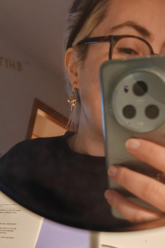 Okay, hear me out. Bei allen Schmuck-Ads, die ich so bekommen habe (wie ihr an meinem Bestellverlauf denken könnt, kriege ich viele!) habe ich bei denen hier gedacht: Das ist zu cool um wahr zu sein und bestimmt ein Scam. Die Teile von Cute Things Commin‘ sehen super artsy und sexy und anders aus. Anfang Dezember war ich anscheinend delulu genug drauf, um es auf eine Bestellung ankommen zu lassen. Ich hab den Ring gesehen, der meinen geliebten Schlangenring noch um einen Mond ergänzt (LOVE IT) und chunky Ohrringe, die quasi die opulente crazy rich Auntie der kleinen schüchternen Sparkle-Studs sind. Seht ihr die Vision?? Naja, das Päckchen kam 10 Tage später! Ich gebe zu: die Sachen fühlen sich nicht sooooo hochwertig an (aber auch nicht nach Kaugummiautomat), aber der Look ist 10/10!