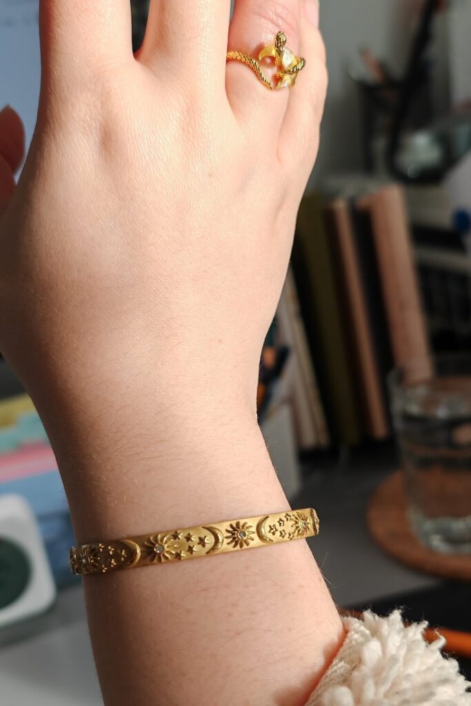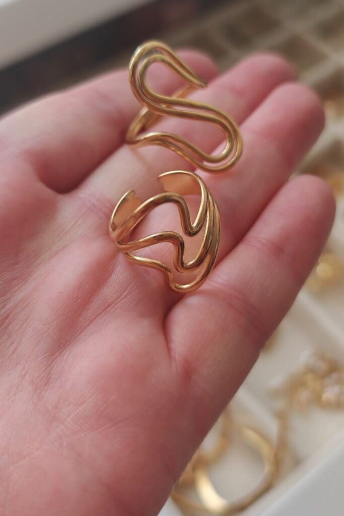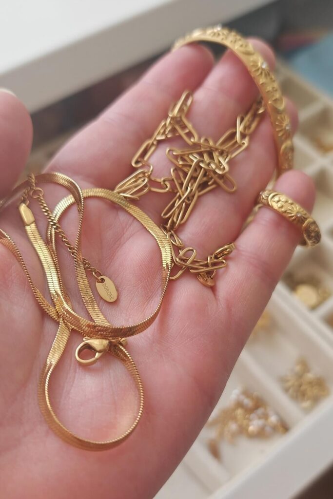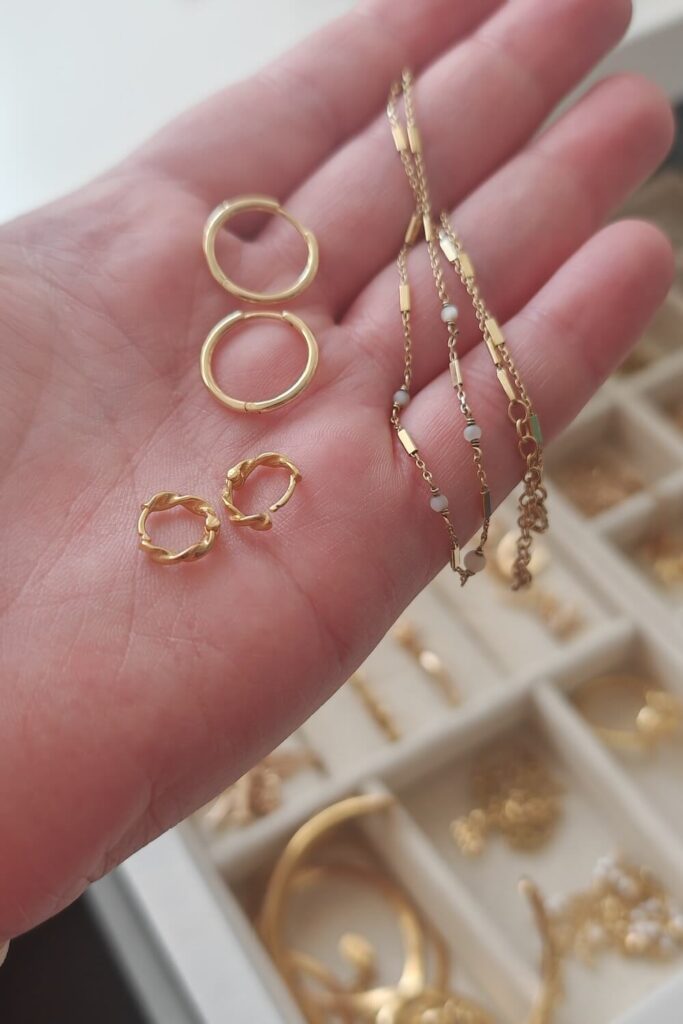 Ich hab ein bisschen gegoogelt und bin natürlich auch schnell von Ads getargeted worden. Es gibt einige Marken, die mit hochwertigem, „wasserfesten“ und trotzdem erschwinglichem Schmuck werben. Manche davon fand ich vom Marketing her so unsympathisch, dass ich mir geschworen habe, dort aus Prinzip nicht zu bestellen 💀 Was sie eint: Bei diesen Marken ist der Schmuck entweder vergoldetes Silber, oder auf Basis von Edelstahl und damit verträglicher und ohne Anlaufen. Das klang erstmal gut, aaaaaber bei der Fülle an Shops war ich mir nicht sicher, welche davon vertrauenswürdig sind und welche dann doch nur Dropshipping-Buden sind…