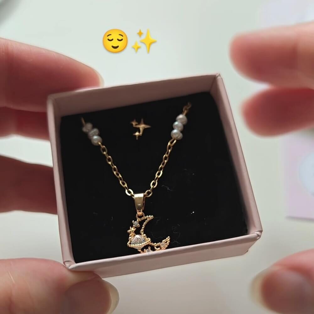 Primrose Delicate Pearls Necklace + Galaxy Moon Pendant + Golden Starburst Stud